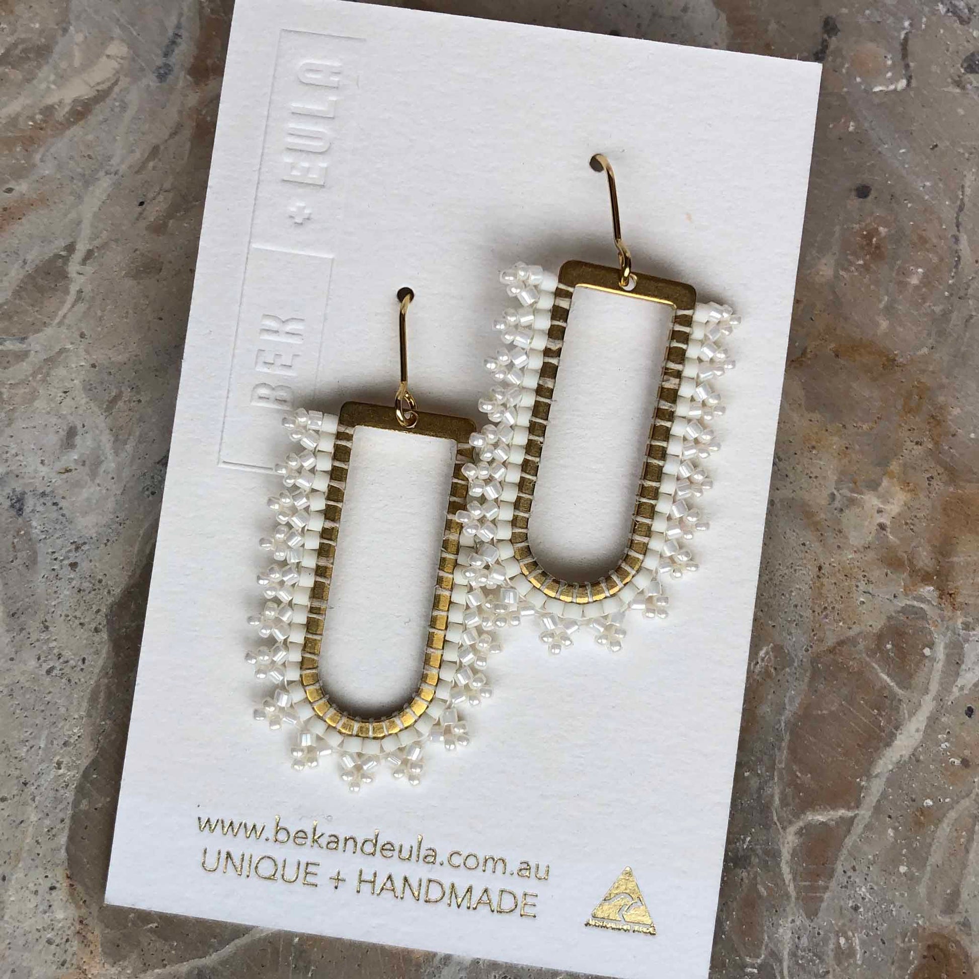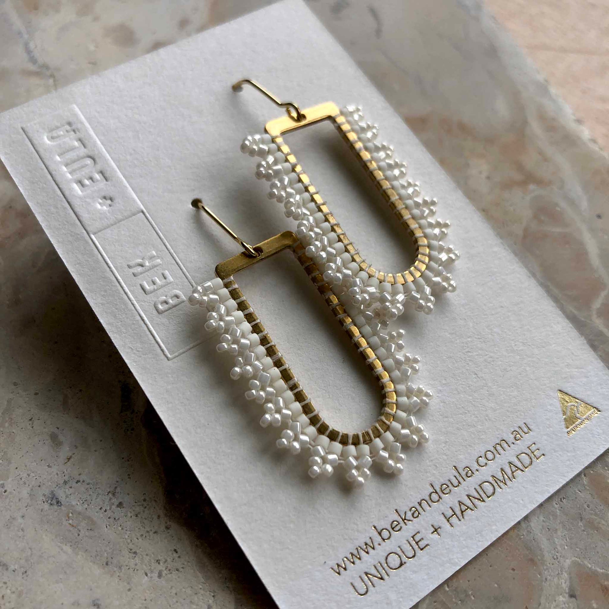 Delicate lace like woven glass bead earrings, on a brass arch/d ring frame.