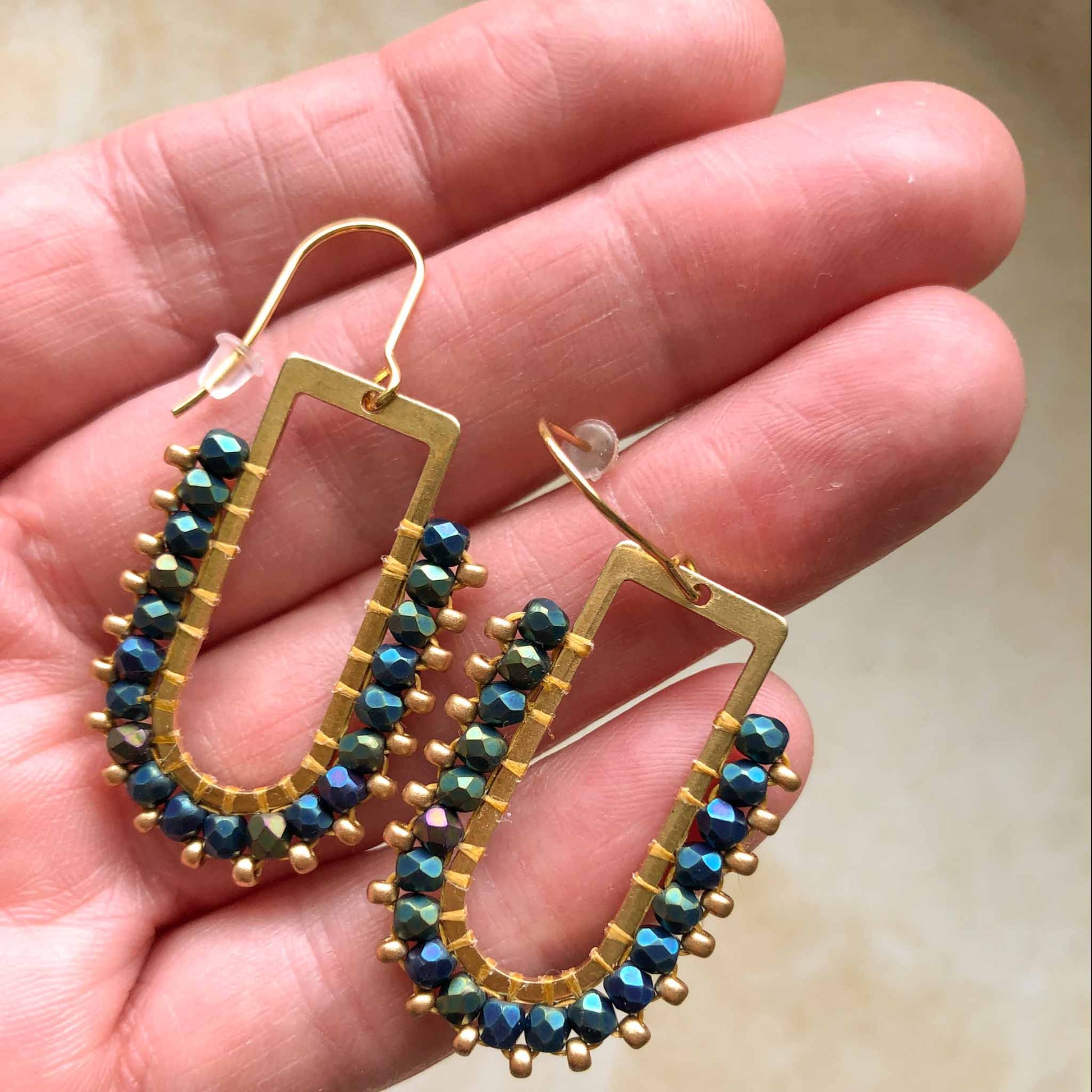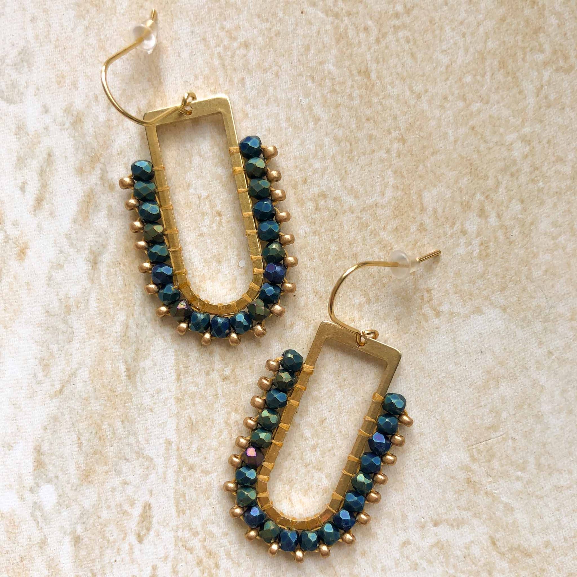 Glamorous and stylish statement woven bead earrings on a d ring brass arch. Handmade in our Melbourne studio these beautiful, lightweight earrings are made using Czech fire polish glass beads with Japanese glass bead detail.