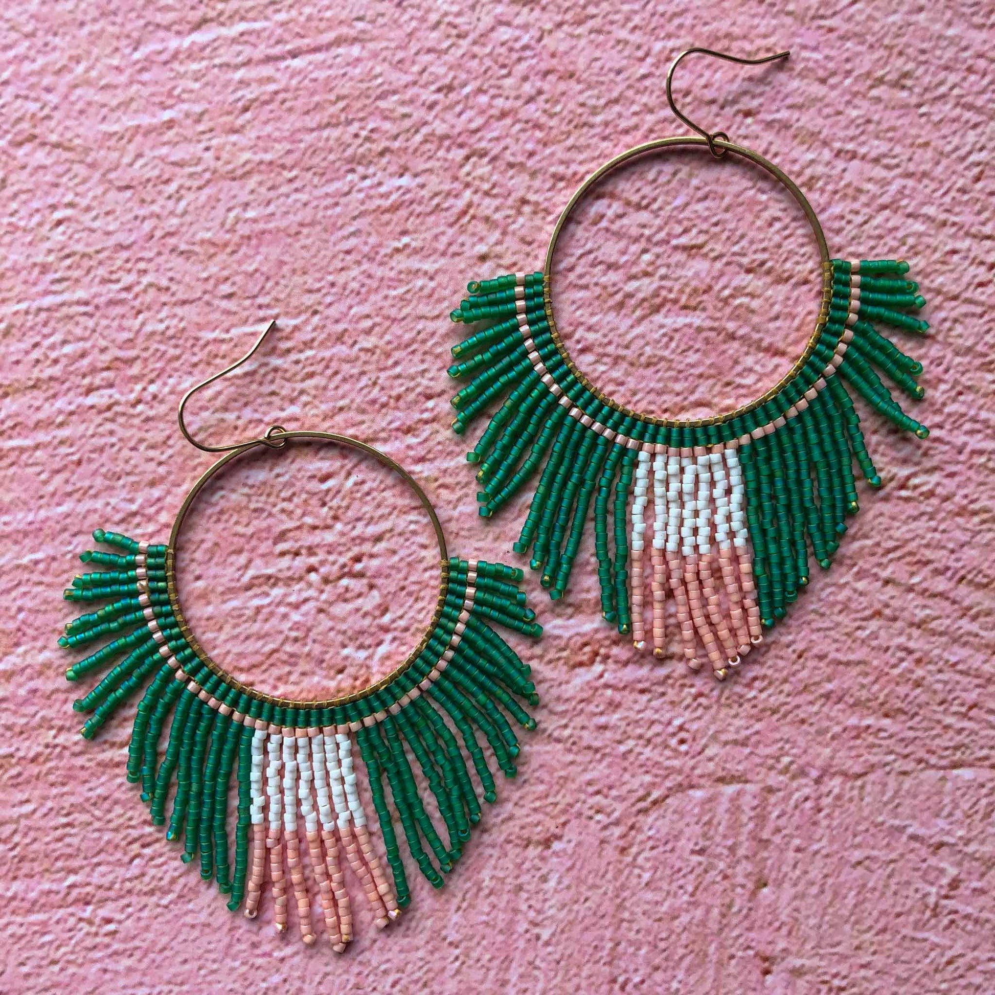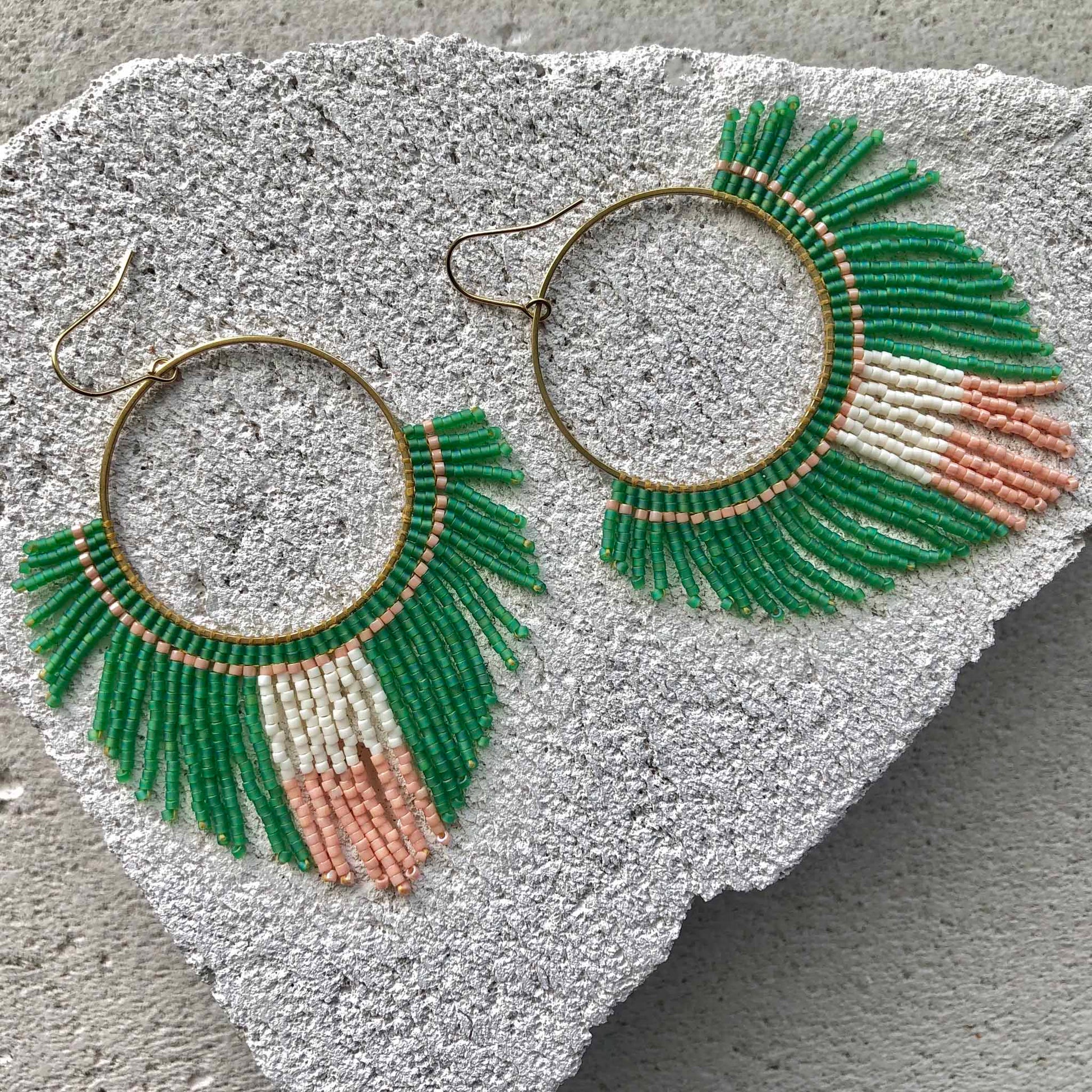 Boho inspired large fringe statement hoop bead earrings are handmade in our Melbourne studio using delicate Japanese Miyuki glass beads. Beautiful and lightweight, these earrings feature opaque green beads with soft peach and cream accent detail.