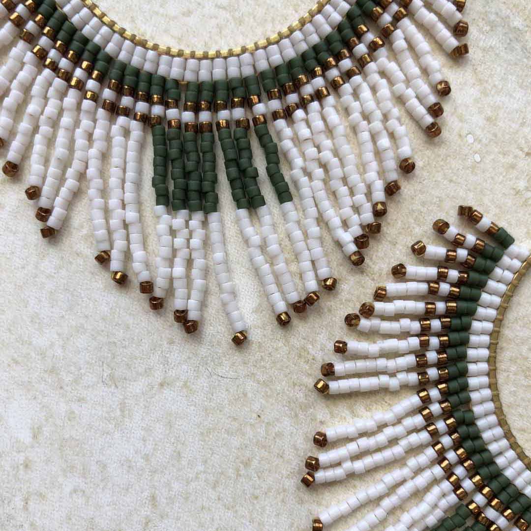 Boho inspired large fringe statement hoop bead earrings are handmade in our Melbourne studio using delicate Japanese Miyuki glass beads. Beautiful and lightweight, these earrings feature white bead with olive green and bronze accents.