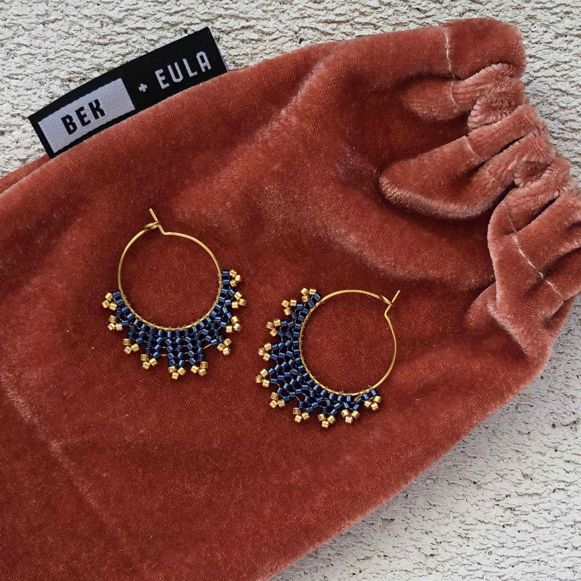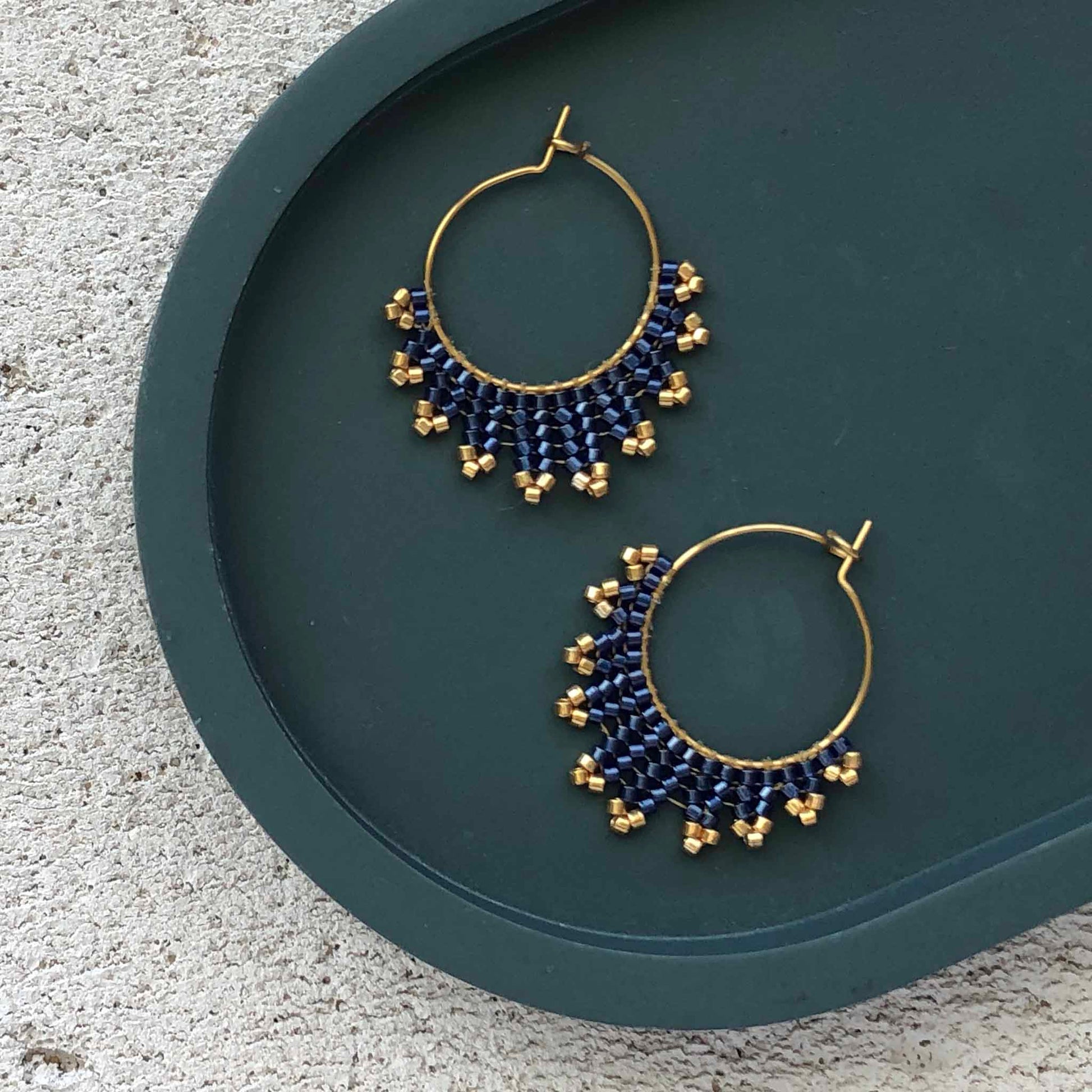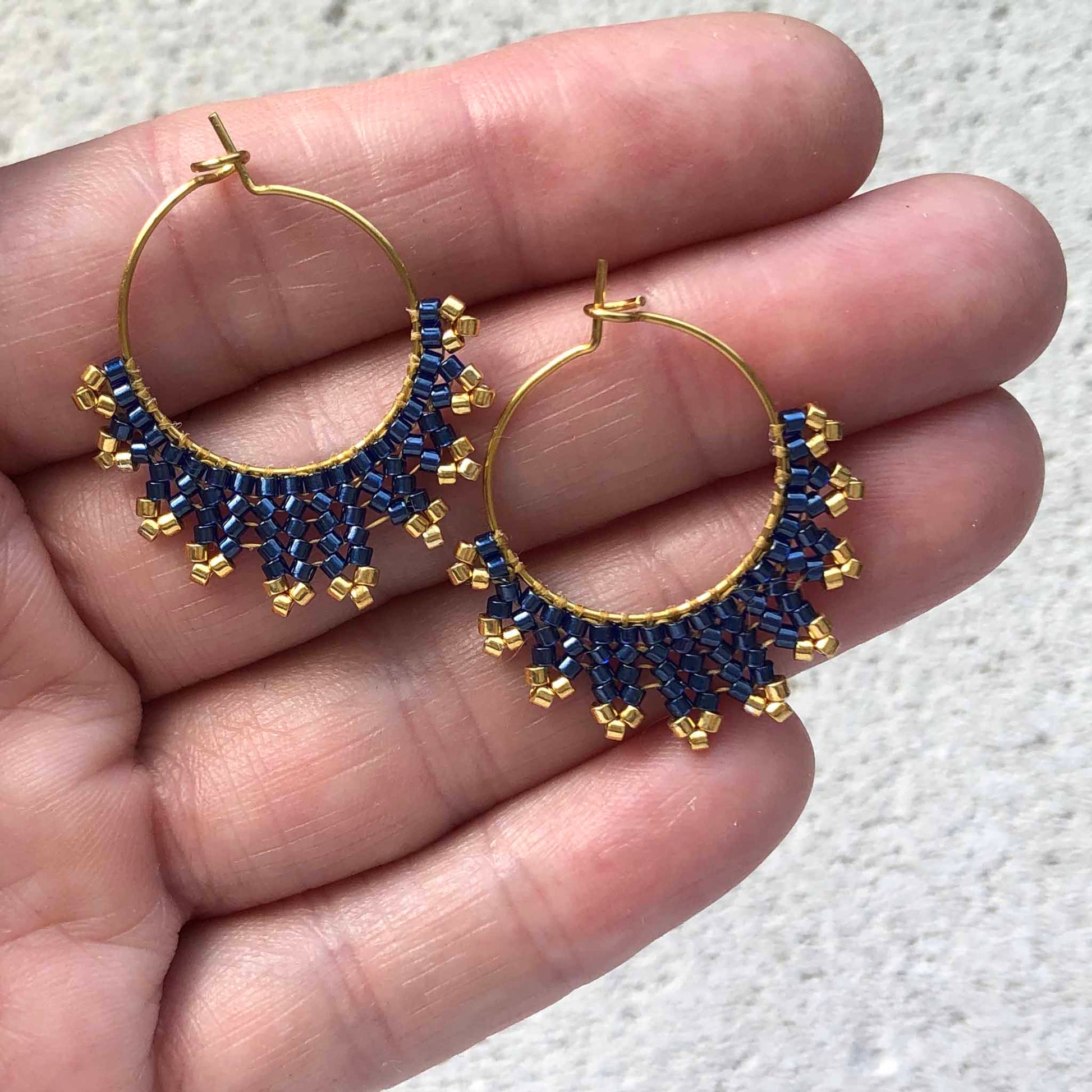 Small Delica Herringbone Hoop Bead Earrings - Midnight Blue/Gold